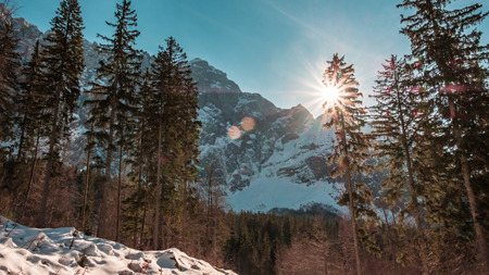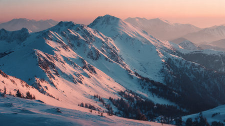 Peaceful panoramic winter landscape with snowy mountain peaks evergreen forest and bright sunlight highlighting the serene alpine valley in cold blue tones. .
