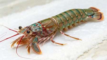 A colorful shrimp with vibrant patterns explores a green aquatic environment highlighting its delicate features in natural light.