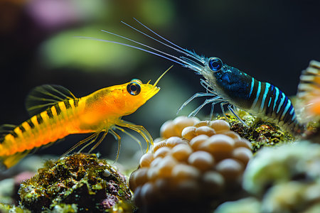 Yellow and blue shrimps engage in a display of vibrant colors against a backdrop of corals in a bustling reef environment. the contrasting hues and delicate underwater ecosystem highlight biodiversity and aquatic interactions. Generative AI