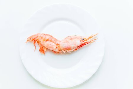 Red shrimp on a white plate and beige background. Minimalistic concept with seafood