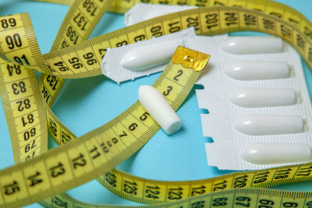 Suppository for anal or vaginal use and yellow measuring tape. Candles for the treatment of obesity, extra weight, for weight loss