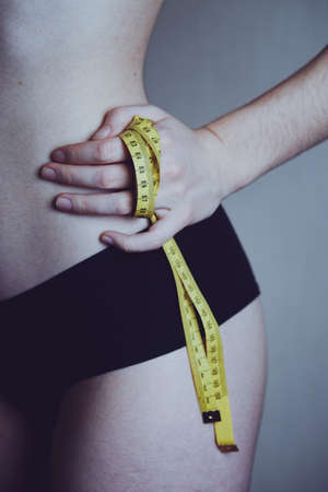 Slim girl with measuring tape in hand. Young beautiful woman measures the his waist.
