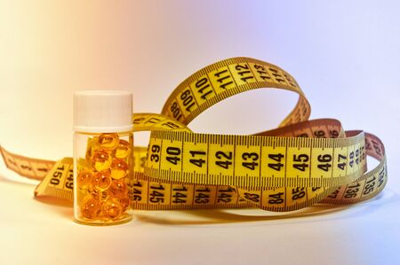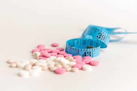 Pills with measuring tape, represent the diet pill industry. concept of losing weight, diet, fat burning, healthy eating.