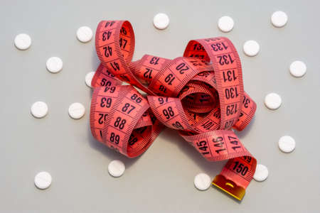Measuring centimeter tape is on grey background surrounded by white round tablets. Concept photo pharmacological weight loss and use of medicines such as sibutramine, orlistat, metformin