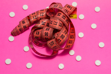A photo of measuring tape and some white pils around on coral color background. A photo can be used to for illustrating some articles or websites about medicine or dietetics