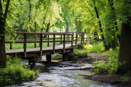 A small wooden bridge spans a gentle stream surrounded by green grass and wildflowers, creating a peaceful scene for nature-themed projects.