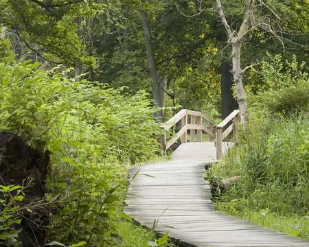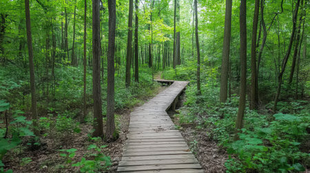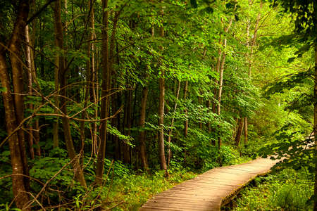 Wooden boardwalk trail winding through tall green deciduous trees under a bright leafy canopy in a tranquil forest