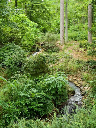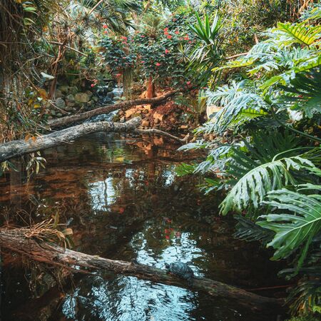 Flowing brook in the rainforest in the covered park the Orchideeën Hoeve in The Netherlands