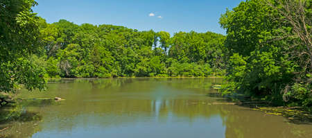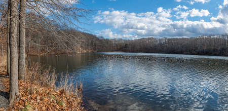 A panoramic view of Hook's Creek Lake in Cheesquake State Park in New Jersey.