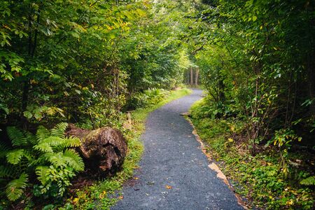 Pathway invites visitors to explore the dense woods, surrounded by vibrant greenery and tall trees on a sunny day.