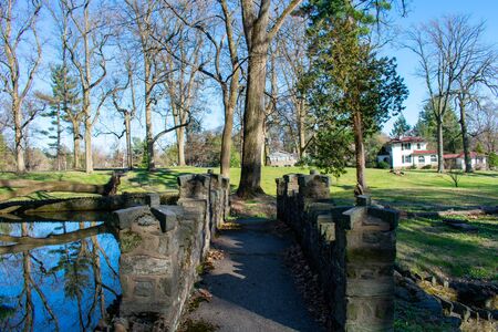 Bridge boardwalk made of wood along a marsh pond in Freedom Park in Naples, Florida