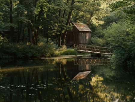 A rustic wooden cabin stands by a tranquil pond, surrounded by lush green trees, with a small bridge leading to it.
