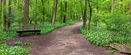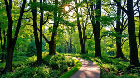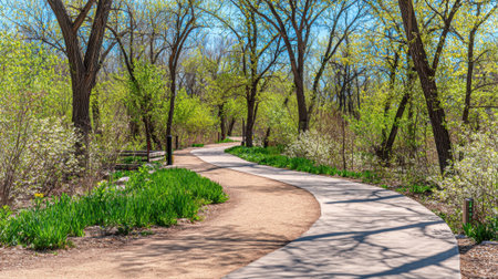 Peaceful curved trail winds through vibrant woodland with budding trees and green shrubs under clear blue sky