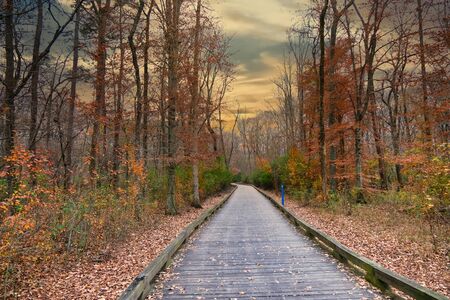 Panorama of a dramatic cloudy sky at sunset over michigan preserve boardwalk in natural wilderness landscape