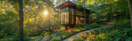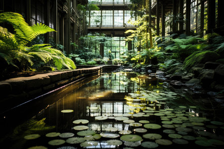 Tropical greenhouse. Lush greenhouse interior with vibrant plants lining a glossy green reflective pathway, natural light streaming through glass roof.