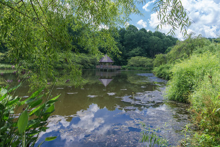 pond with a wooden gazebo in a summer park. Green lawn and bushes.