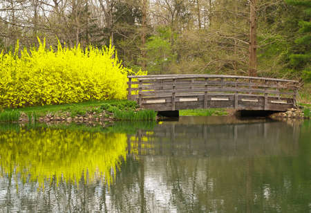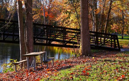 A peaceful autumn scene featuring a charming wooden bridge over a reflective creek, surrounded by vibrant foliage, creating a serene natural setting.