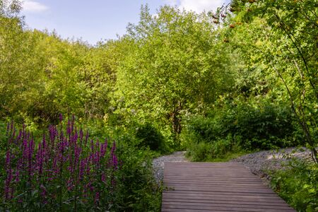 wooden sidewalk and branching paths in a nature park with purple flowers