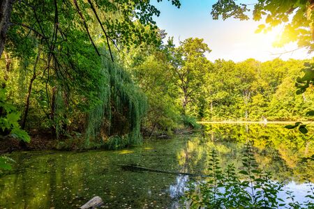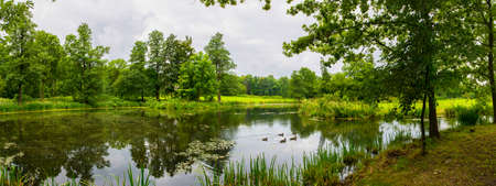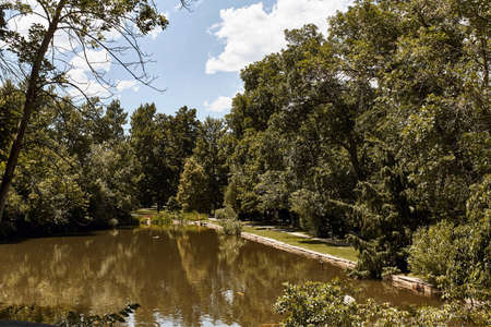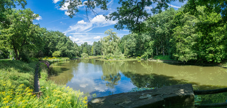 Panorama of a public park in the city. Sunny picture with trees and a lake. Luisenhain, Bamberg.