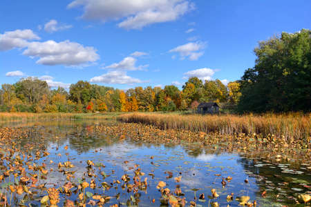 autumn nature landscape with lake or river water and trees with colorful leaves, fall season.