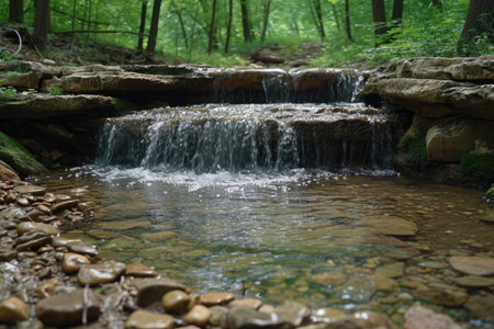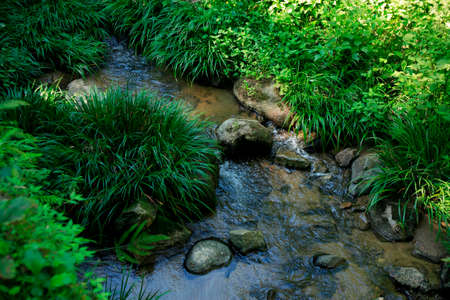 tropical river landscape, exotic nature scenery, peaceful brook, forest background