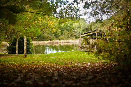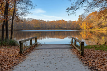 Colors of autumn reflect on the calm surface of the lake. A wooden bridge leads to the water, surrounded by trees in vivid fall hues under a clear sky.