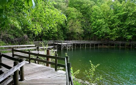 Wooden walkway in the park. Spring landscape with lake and forest.