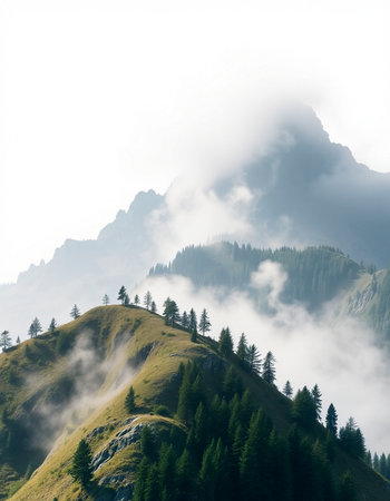 Mountain landscape of the Swiss alps on a foggy day