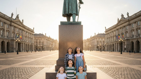 Cinematic 16:9 panoramic wide shot capturing three children standing beneath a massive bronze statue