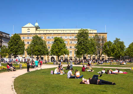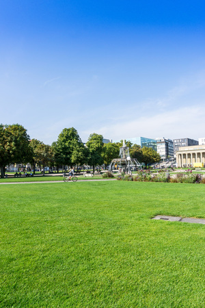 People are enjoying a sunny day at Schlossplatz in Stuttgart, Germany