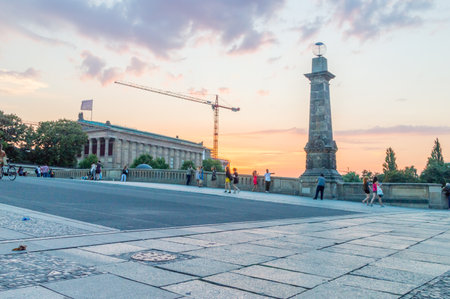 Berlin, Germany - August 17, 2018: Friedrichs Brucke bridge with undefined people at sunset.