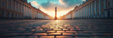Historic Architecture of St. Petersburg Sunrise Over Cobblestone Street and Majestic Building