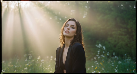 Portrait of a woman in a black dress outdoors on a meadow in the mountains