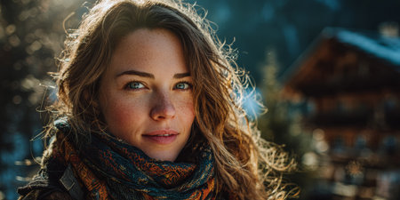 A young woman with curly hair stands outside, wearing a colorful scarf. She smiles warmly at the camera, surrounded by beautiful nature and rustic cabins, illuminated by bright sunlight.