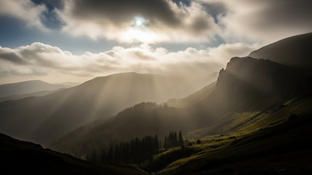 Dramatic sun rays pierce through dark clouds, illuminating a rugged mountain landscape with a dark pine forest in the valley below.