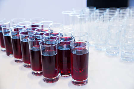 Group of glasses with cherry juice on the table . glasses of cherry juice .Row of Glasses with Fresh cherry Juice. Catering concept. Bokeh blurred background. Selective focus .
