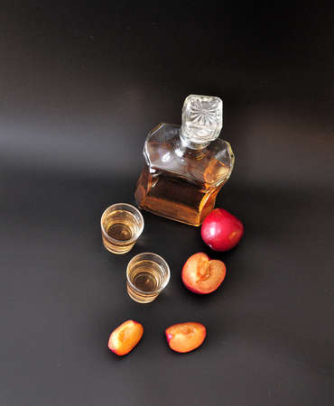 A bottle and two glasses with an alcoholic drink and slices of ripe plums on a black background. Flat lay.