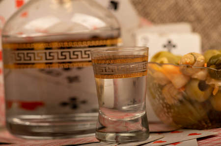 vodka in glass and appetizer on table