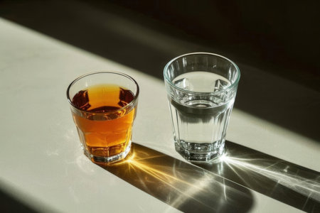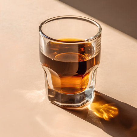 Whiskey in a glass on a beige background with shadows