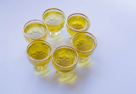 Circle of small shotglasses with golden olive oil