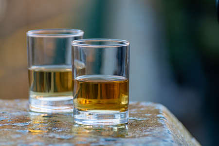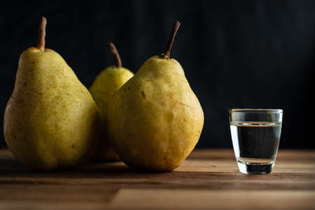 Close up on homemade strong alcohol drink from pear brandy in shot glass rakia brandy traditional drink made in serbia croatia bulgaria or bosnia with selective focus dark background