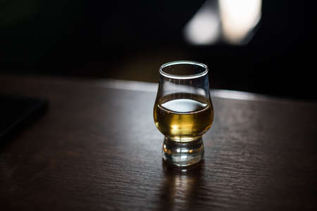 Welcome drink concept. Single shot of whiskey on the bar with blurred background. Toned image.