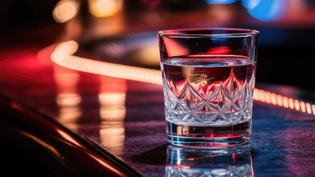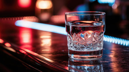 A cut-glass tumbler filled with water sits on a bar reflecting neon lights.