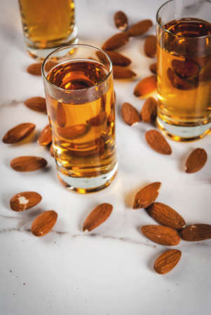 Golden almond liqueur with nuts on white marble background. copy space