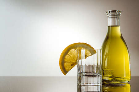 Classical limonchello in the glass and lemons