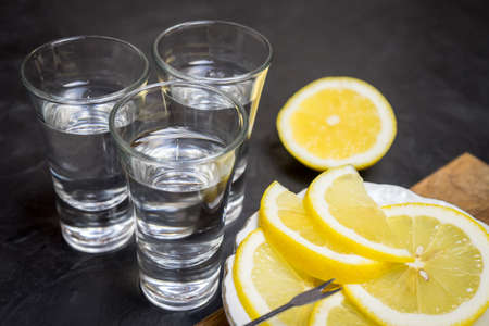 Glass of vodka. And lemon slicing on a plate. Place for your text.,,