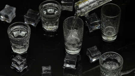 Bartender pouring up frozen vodka from a bottle into four shots glasses with ice cubes against black background. Barman pour of clear transparent alcohol drink rum tequila in shot-glass