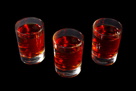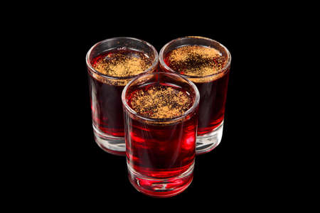 Red transparent cocktails, a set of shots pile, wedge, three servings, with taste of berries, cherries, strawberries, greiprut, cola. Side view from above Isolated black background