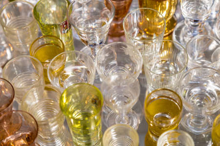 Empty shot glasses for alcohol in the bar.