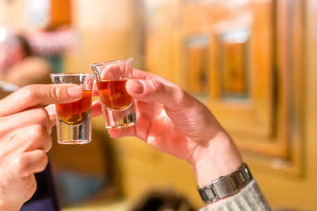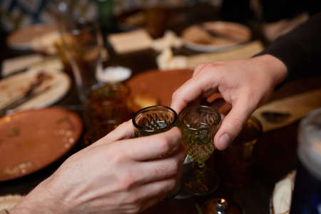 male hands having toast with shot glasses of grappa